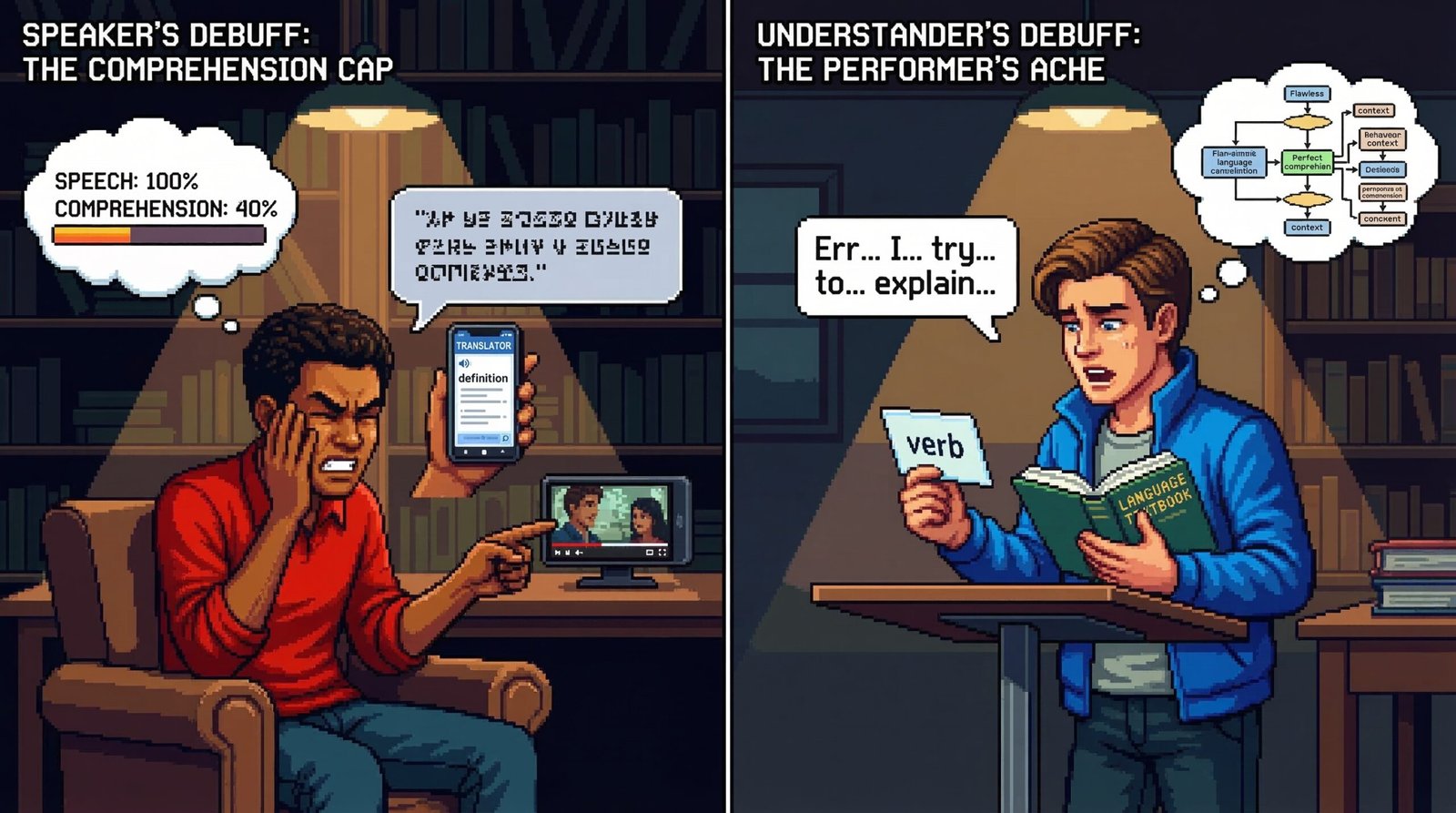 Meanwhile, every conversation I have, even the awkward, stumbling, accent-heavy ones, is speaking practice. My debuffs shrink automatically because the act of living in the language IS the exercise. The muscle gets worked every single day. Your debuffs require a completely separate training regimen that has nothing to do with your maxed-out skill.